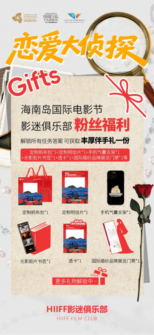 解锁所有任务答案的影迷,即可获得“真爱纪念礼包”!内含一群资深电影发烧友——海南岛国际电影节影迷俱乐部成员自发准备的限定纪念礼物,以及由三亚国际婚纱时尚周和三亚CBD文物艺术中心准备的精美限定礼物,让“恋爱大侦探”们不虚此行!