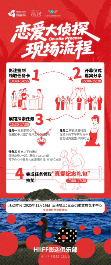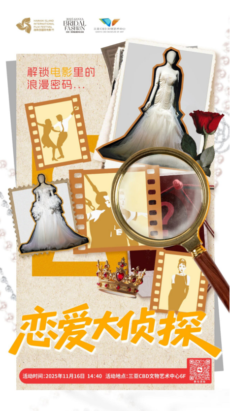 当“电影”遇见“婚纱”,爱情不止存在于镜头之中。11月16日,海南岛国际电影节影迷俱乐部将联合三亚国际婚纱时尚周,在三亚CBD文物艺术中心开启一场沉浸式互动体验——《恋爱大侦探》。这里没有旁观者,每一位影迷,都是故事的主角。
