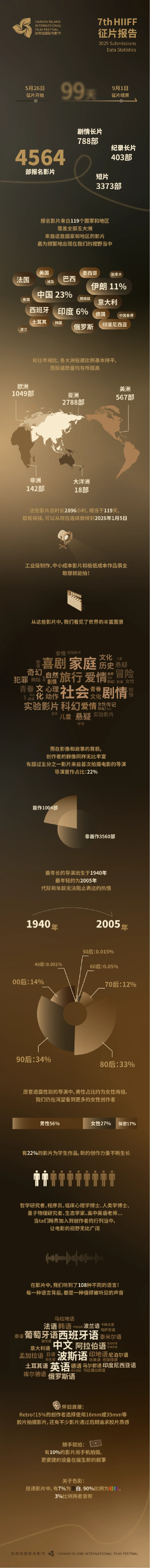 在这样的背景之下,海南岛国际电影节迎来了第七个征片季。从2025年5月26日至9月1日,在本届电影节为期99天的征片当中,共有来自119个国家和地区的4564部影片报名,数量创历史新高。这不仅印证了海南岛国际电影节国际化视野和全球影响力的同时,也向我们呈现了一个具有丰富生命力的世界电影生态。