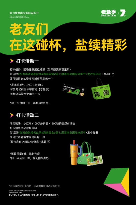 当老盐季正式成为第七届海南岛国际电影节官方特色饮品合作伙伴,这场「本土风味」与「国际舞台」的相遇,不仅是一次品牌与盛事的联动,更是老盐季推广城市风味和本土文化的绝佳契机。